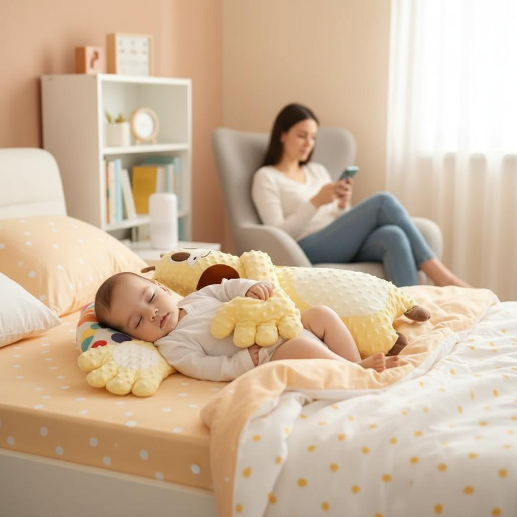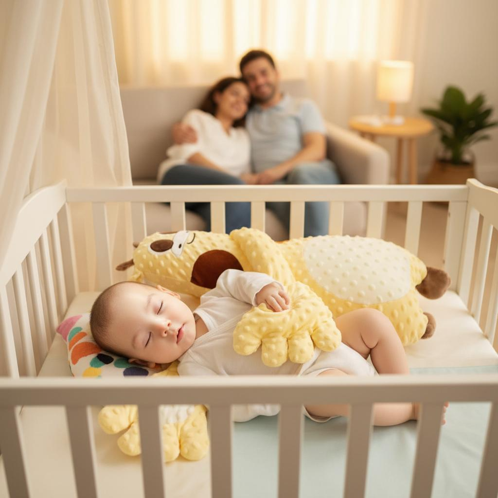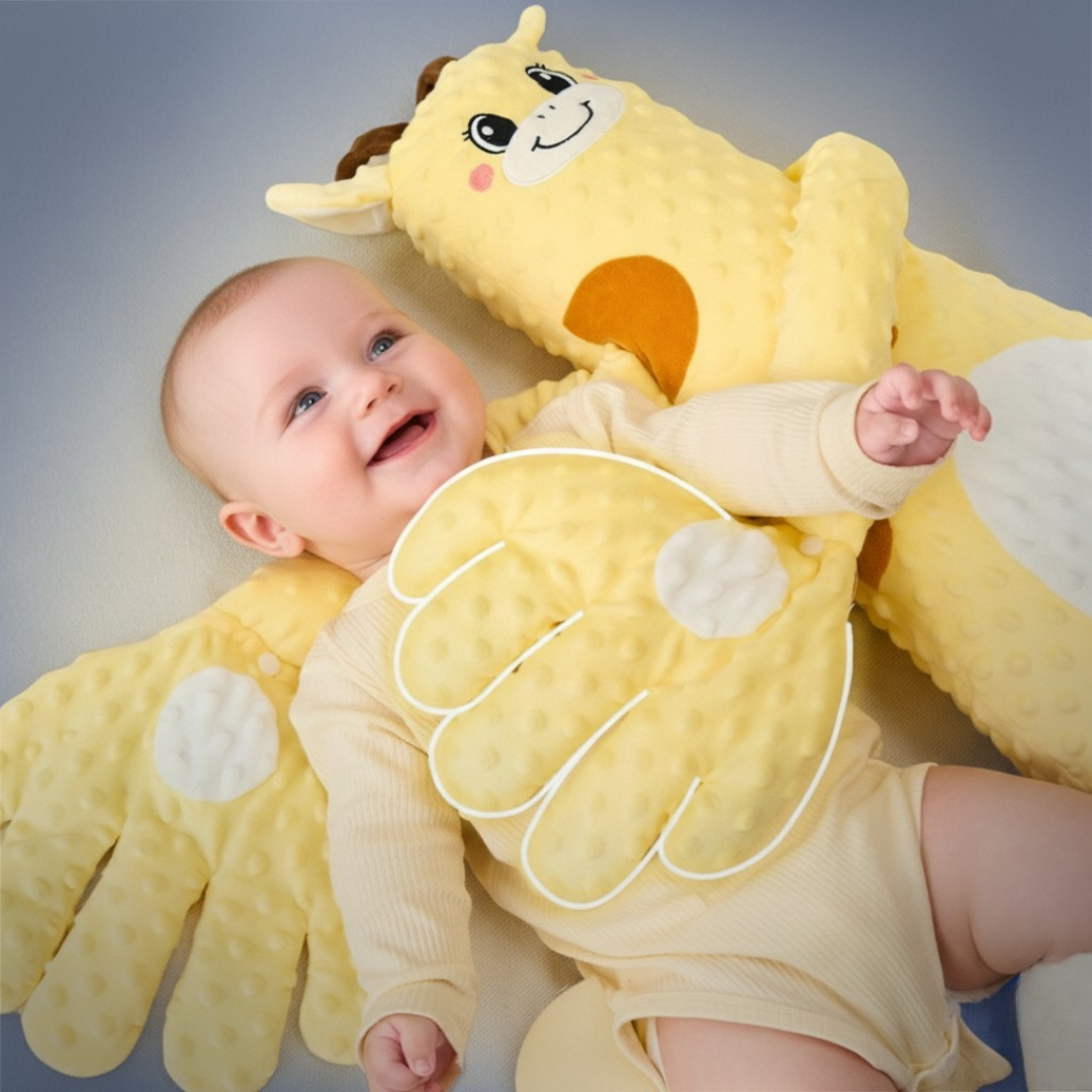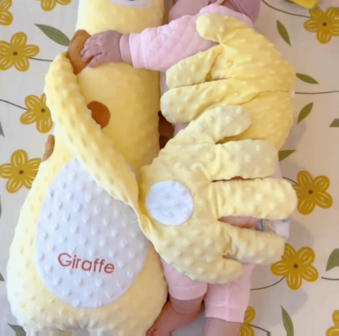 Ölelő forma: A zsiráf alakú párna körülöleli a babát, így biztonságérzetet nyújt.